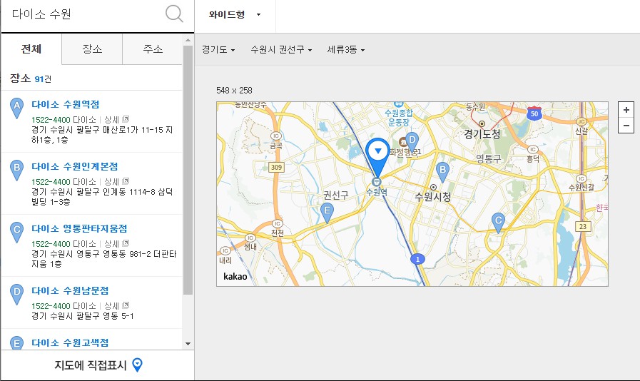 - 검색창에 **'다이소'**를 입력하면, 현재 위치 기준으로 가까운 매장이 지도에 표시됩니다.