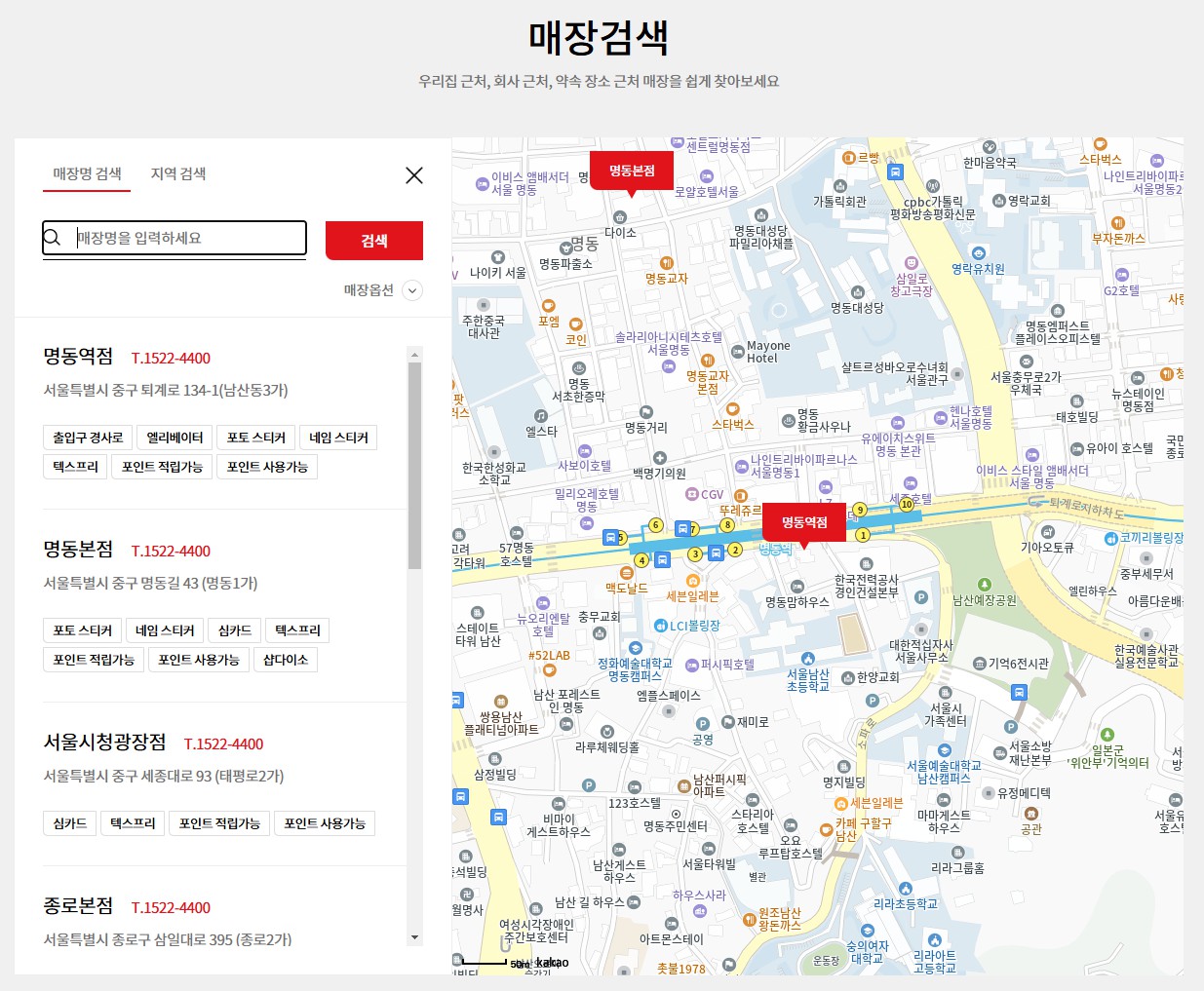 - 지역별 또는 매장명을 입력하여 가까운 매장을 검색할 수 있습니다.