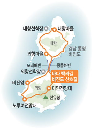 - 비진항 → 선유봉 → 노루여 전망대 → 하산 (약 3시간 소요)